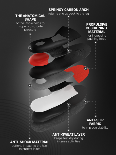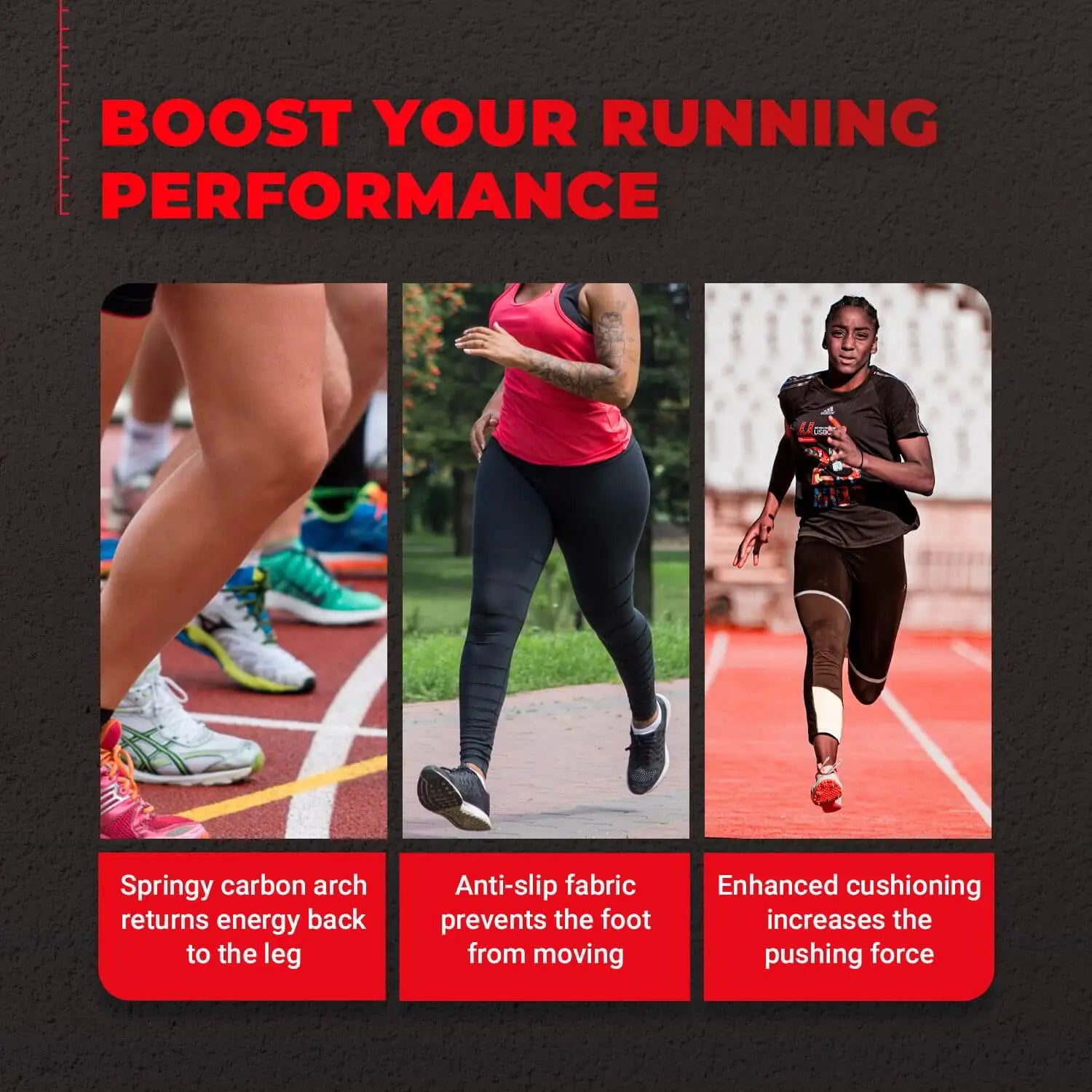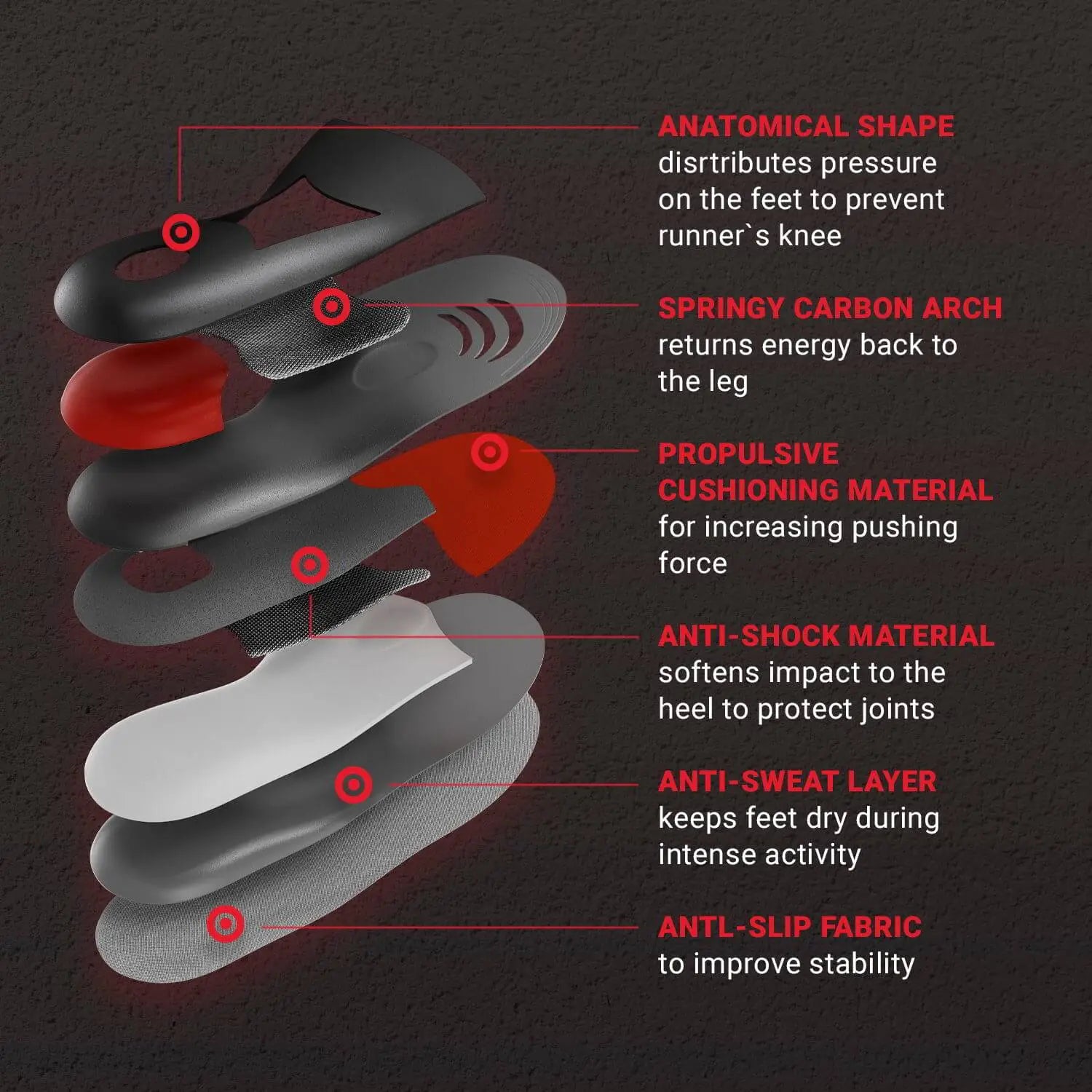 EASYFEET Running Insoles feature a low, springy carbon arch design, providing optimal support while running and during workouts for various foot types. The arch support offered by these insoles helps to maintain proper foot alignment and to improve your stability. The low, springy arch contour provides stability and flexibility, ensuring that your feet remain supported without feeling overly rigid.