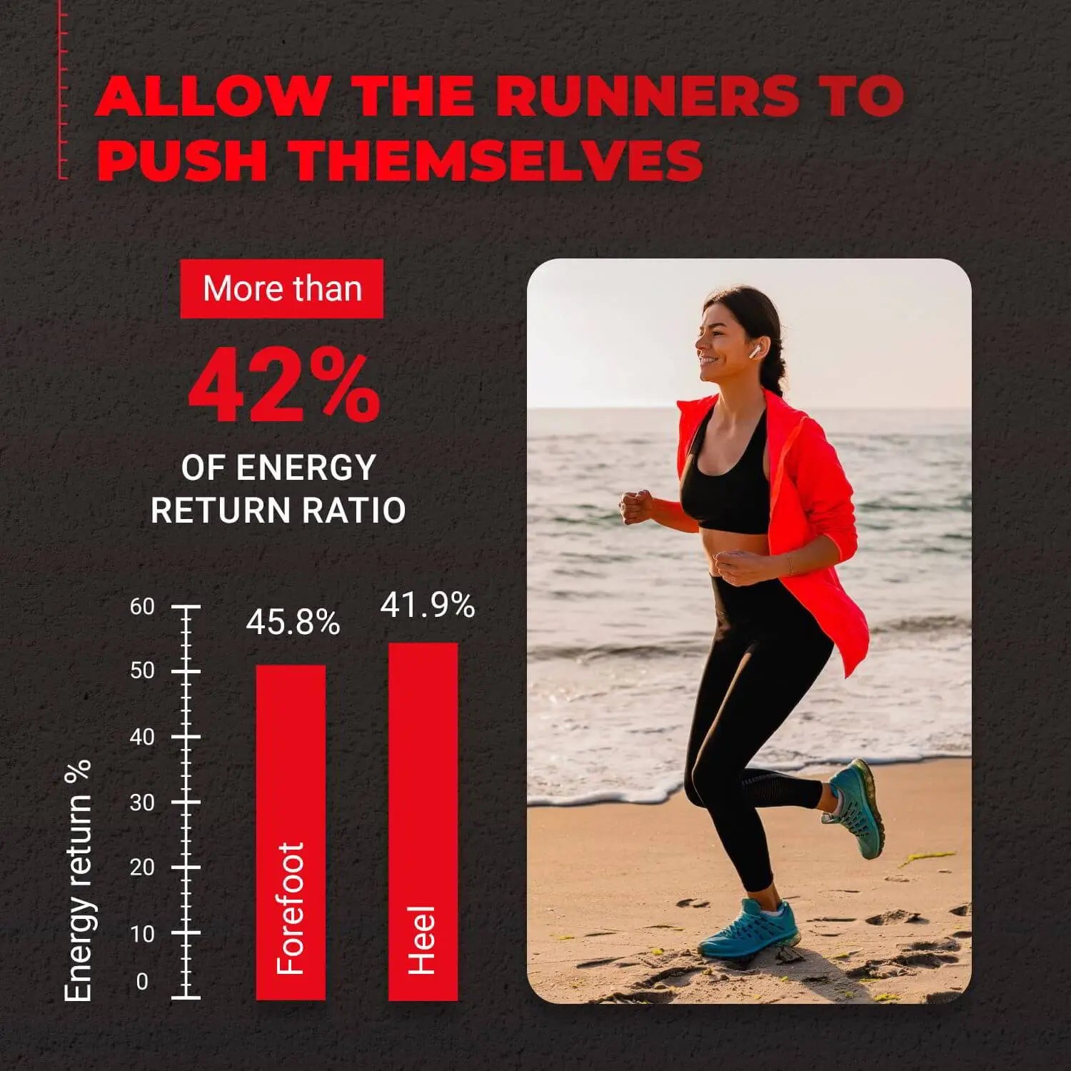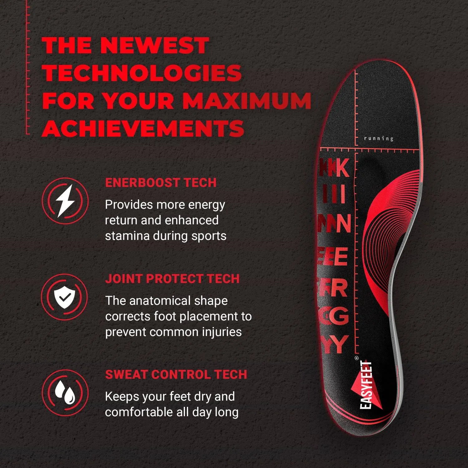 To help you maintain your endurance and perform at your best, EASYFEET Running Insoles are engineered with energy-returning properties, which means that they absorb the energy generated from your movements and then release it back to your feet. Thanks to their springy structure, they allow the return of more than 45 percent of energy back to the foot.