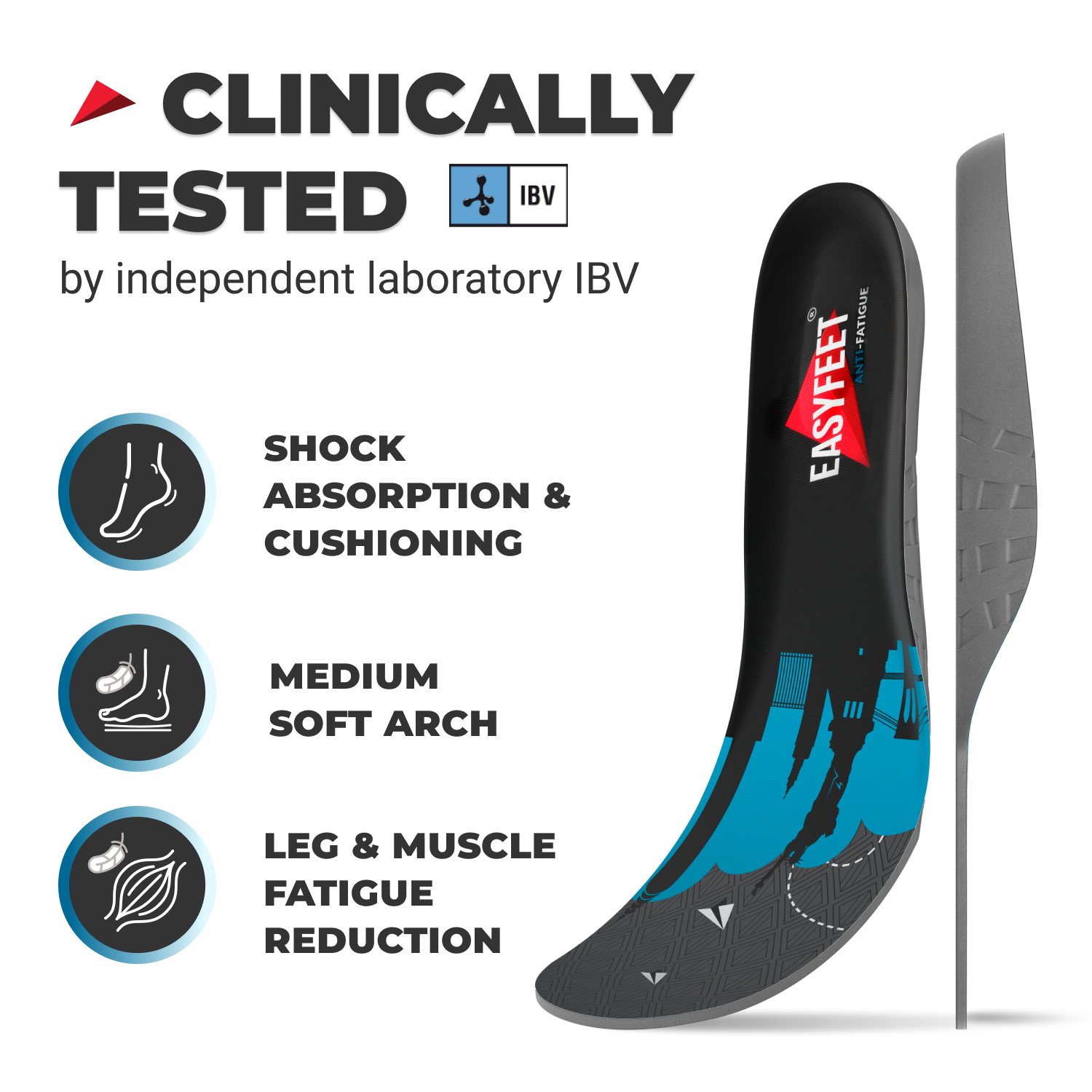 With EASYFEET personal anti-fatigue insoles, both men and women can enjoy better foot support and a steady flow of energy. Superior comfort is achieved through the fabric's breathability. These insoles are designed to fit various types of shoes, making them the best anti-fatigue option available.
