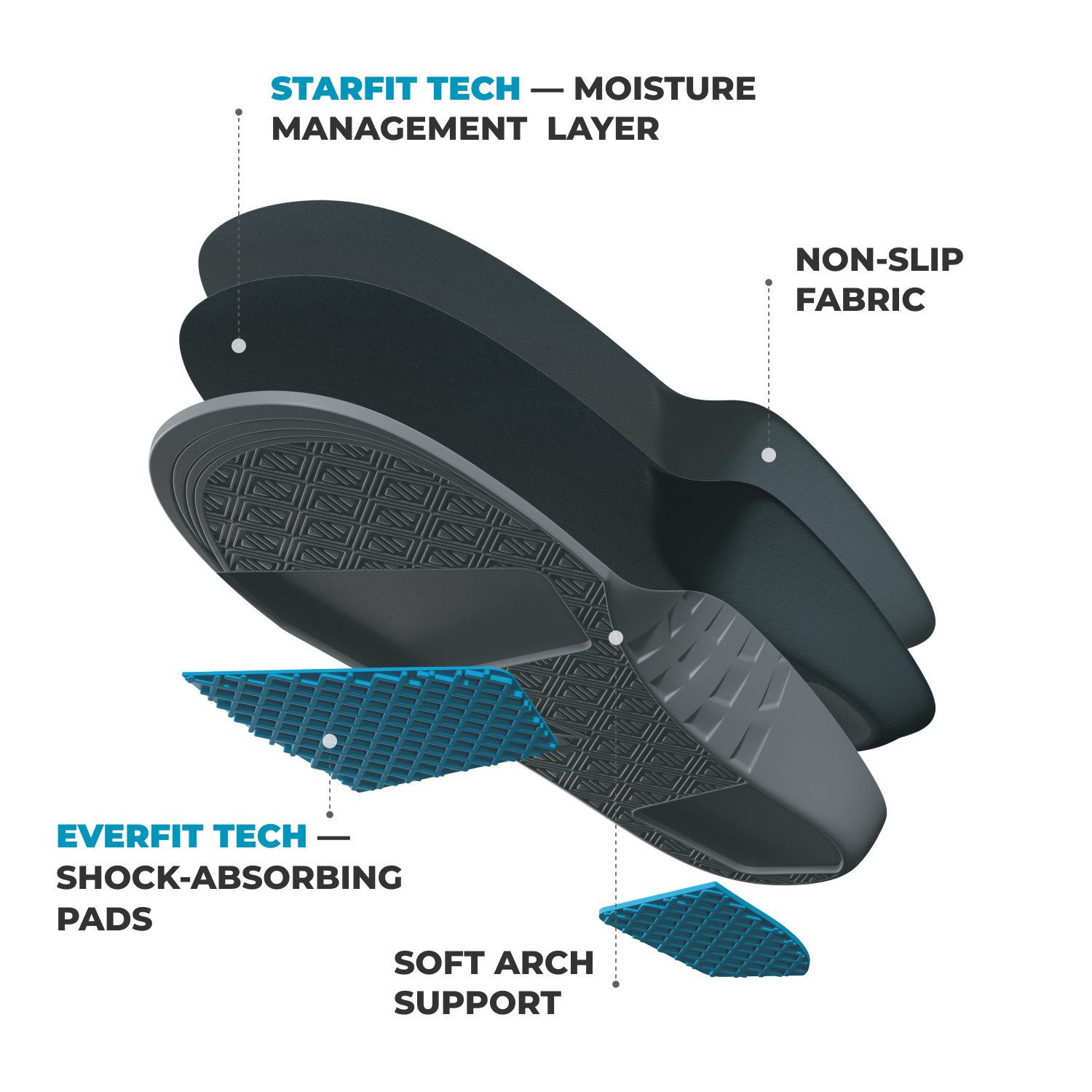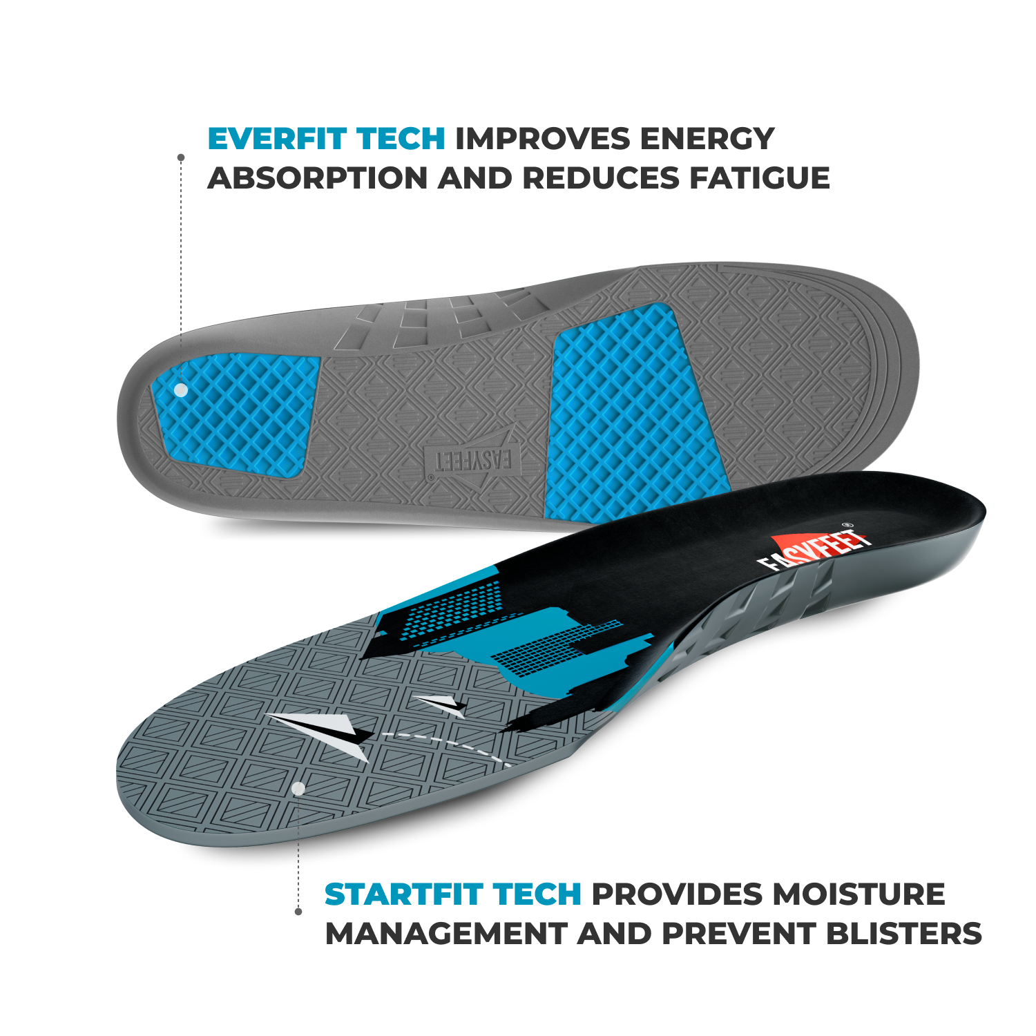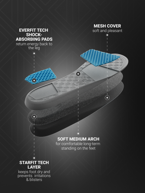 The shock-absorbing cushioning pads of the Everfit technology give your feet a break from the impact of daily activities and increase your stamina by the ability to cushion high-pressure zones and transmit that energy back to the foot and leg.