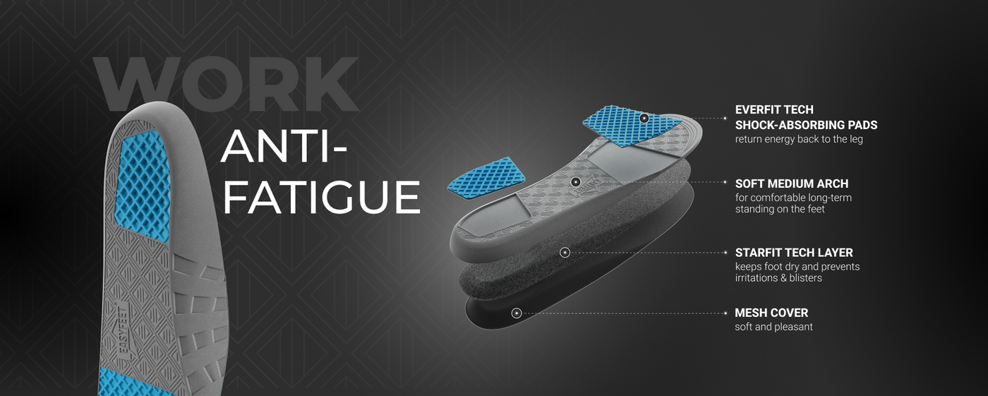 People whose jobs need them to be on their feet for long periods will benefit from using orthotic work insoles. Also helpful for individuals whose legs and feet hurt at the end of the day. If EASYFEET you're looking for a way to maintain your energy, boost your productivity, and feel comfortable in the workplace, our orthotic insoles are the way to go.