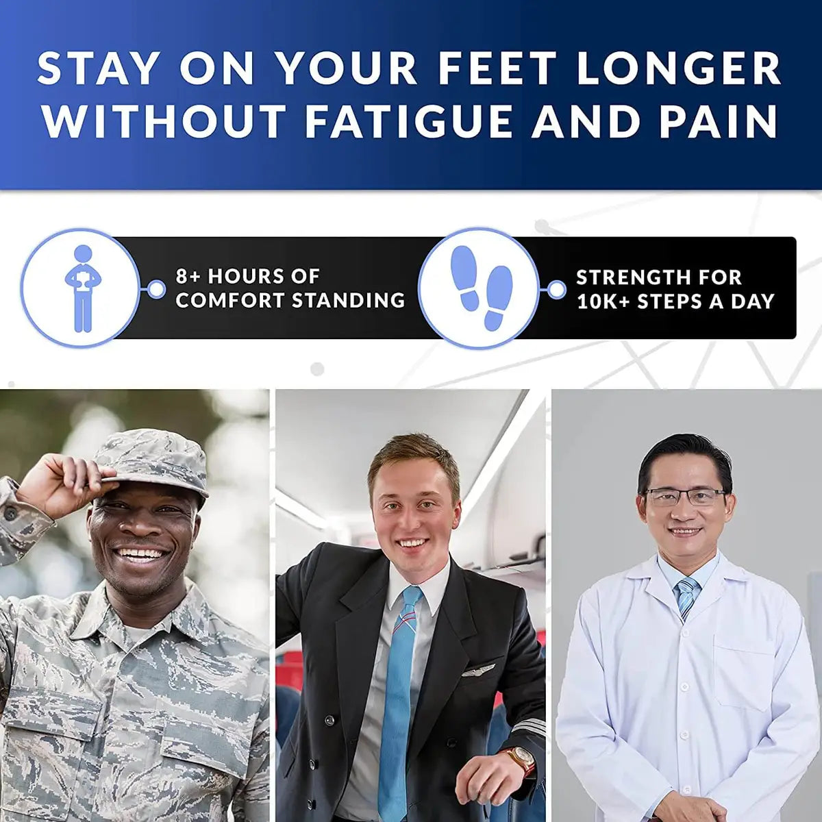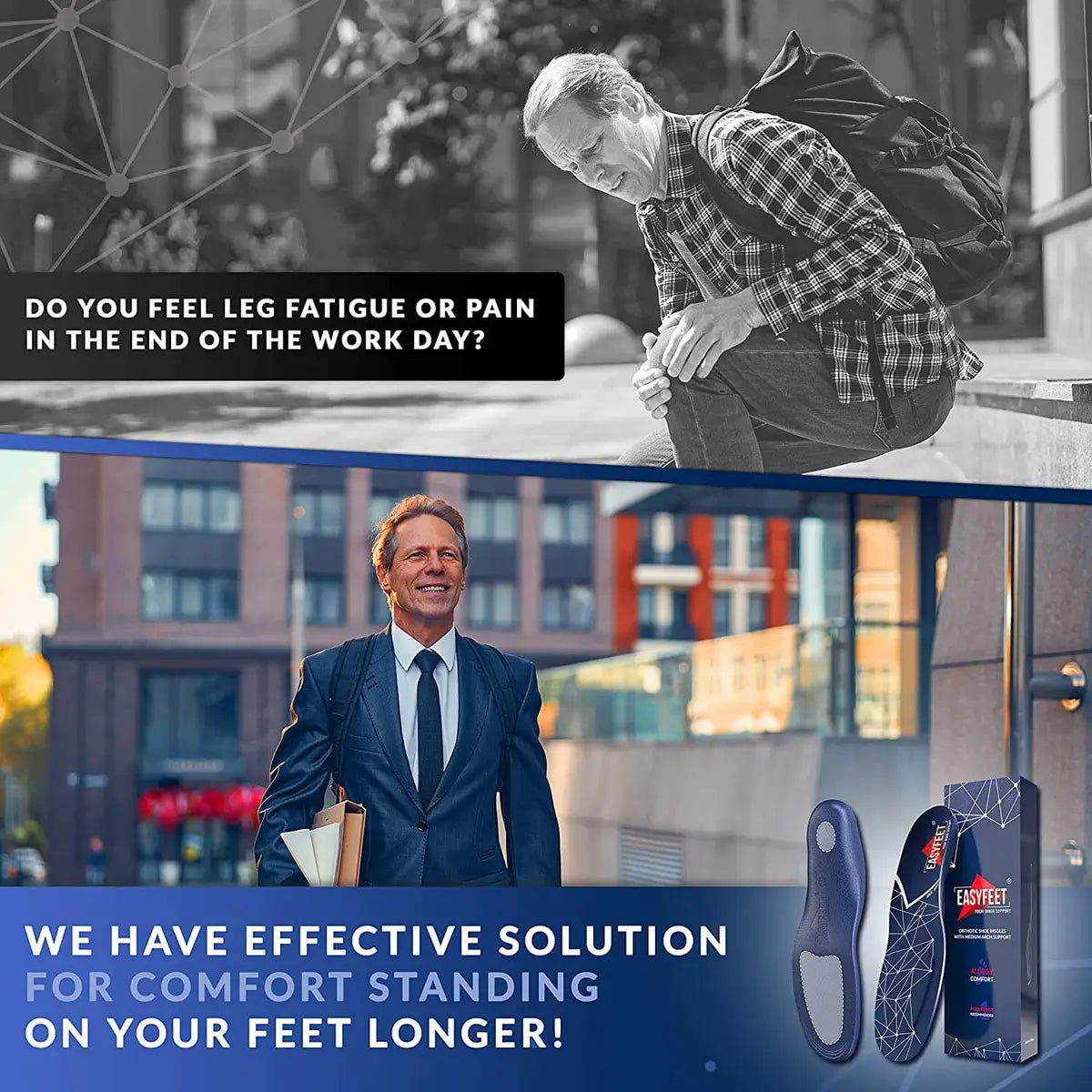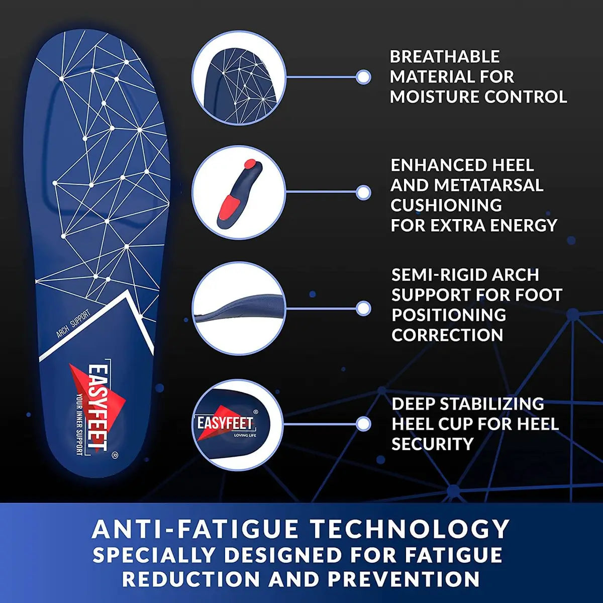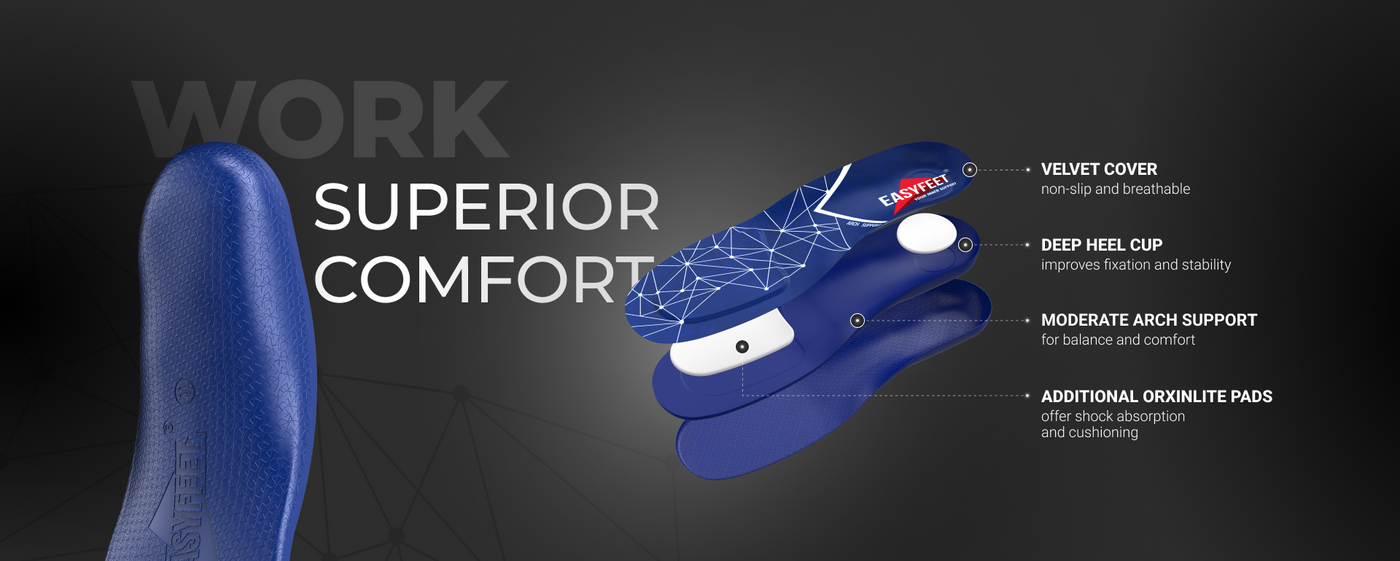 EASYFEET orthotic work insoles are anti-fatigue medium arch insoles designed for people who stand for extended periods in their jobs and experience weariness and soreness in their feet and legs at the end of the day. Orthotic work insoles provide the best way for you to maintain energy, enhance work performance, and experience exceptional comfort all day long.