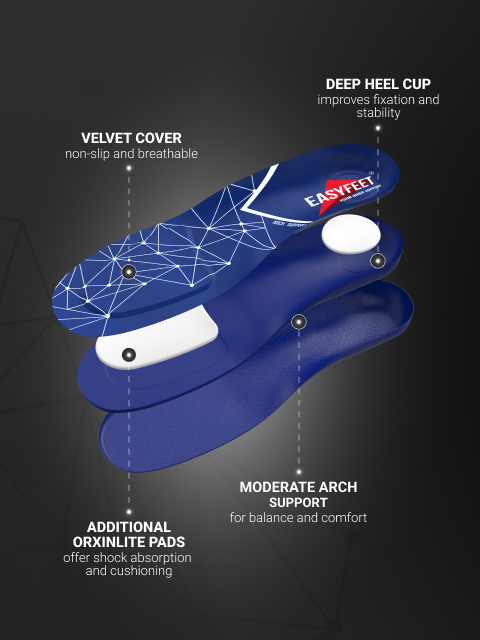 EASYFEET medium arch insoles for flat feet support the longitudinal and transverse arches of the foot, lowering stress on the feet and the spine. They are suitable for difficulties related to plantar fasciitis and help prevent pathological disorders of the foot. A semi-rigid arch supports the feet and makes it possible to treat the symptoms of flat feet, corns and bunions, ankle discomfort, and other foot-related issues like strains in the ankle, knees, hip, and back pain.